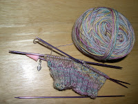 I've only got the cuff and half of the first 12 rows done, just to see if I could do the lace. I think the lace pattern will be much more visible when I'm actually wearing the finished sock. It's kind of bunched up on itself now.